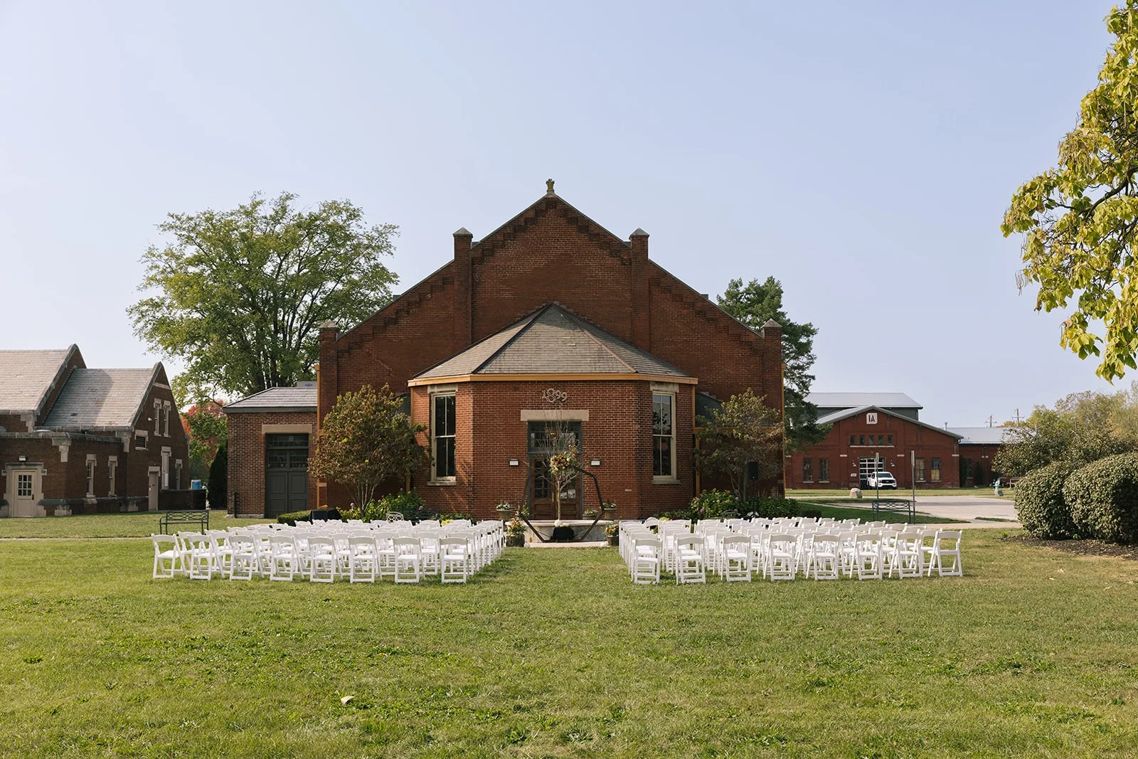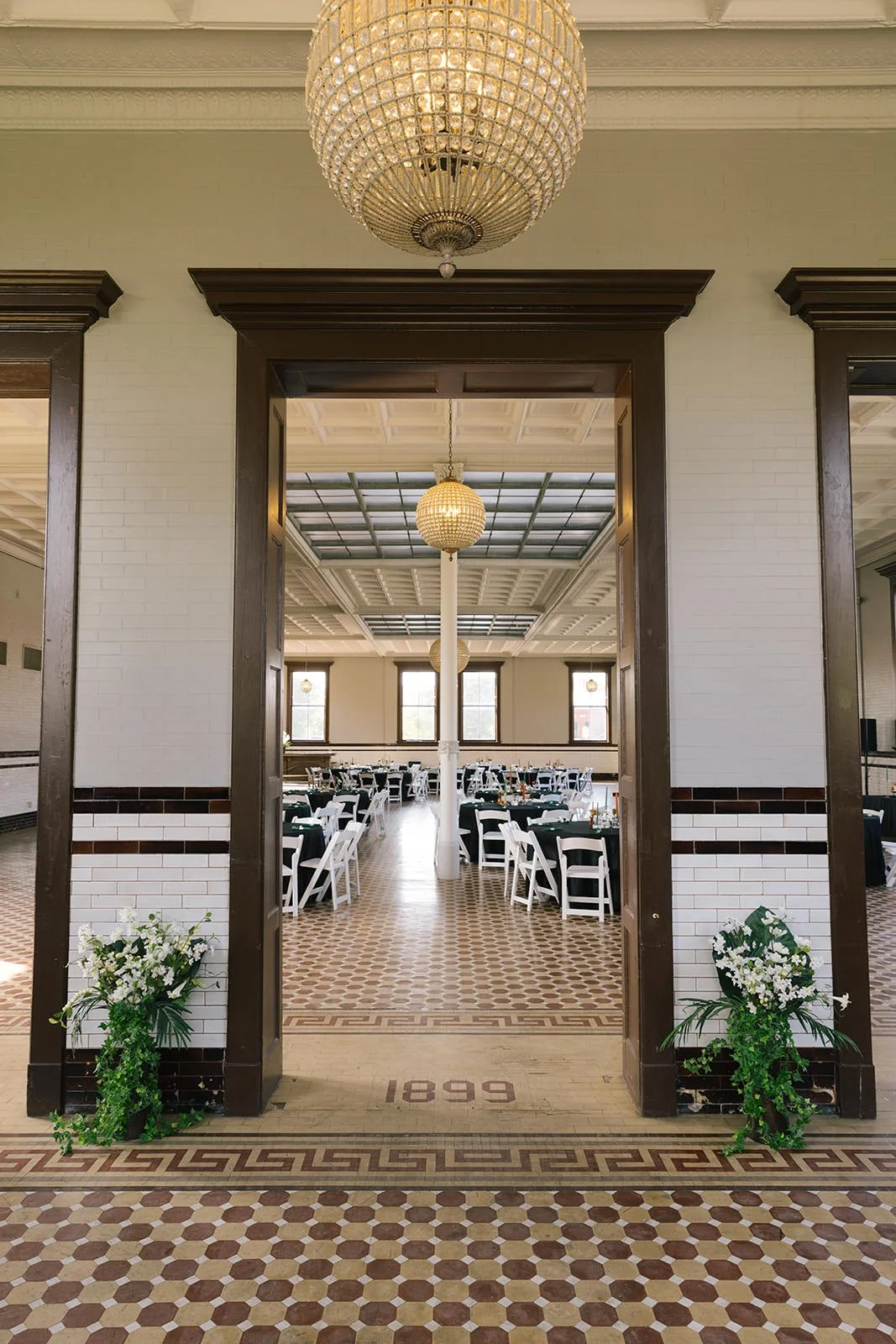 1899 Events (sometimes styled “The 1889” in conversation) is housed in a beautifully restored building in Central State Village, with a classic brick exterior, original tile floors, tin ceilings, and crystal chandeliers inside. It’s one of those venues that feels grounded in history but ready for today's celebrations. The large windows let in soft, natural light — perfect for dreamy portraits — while the spacious indoor ballroom and outdoor greenery give you flexibility in how you use the space.